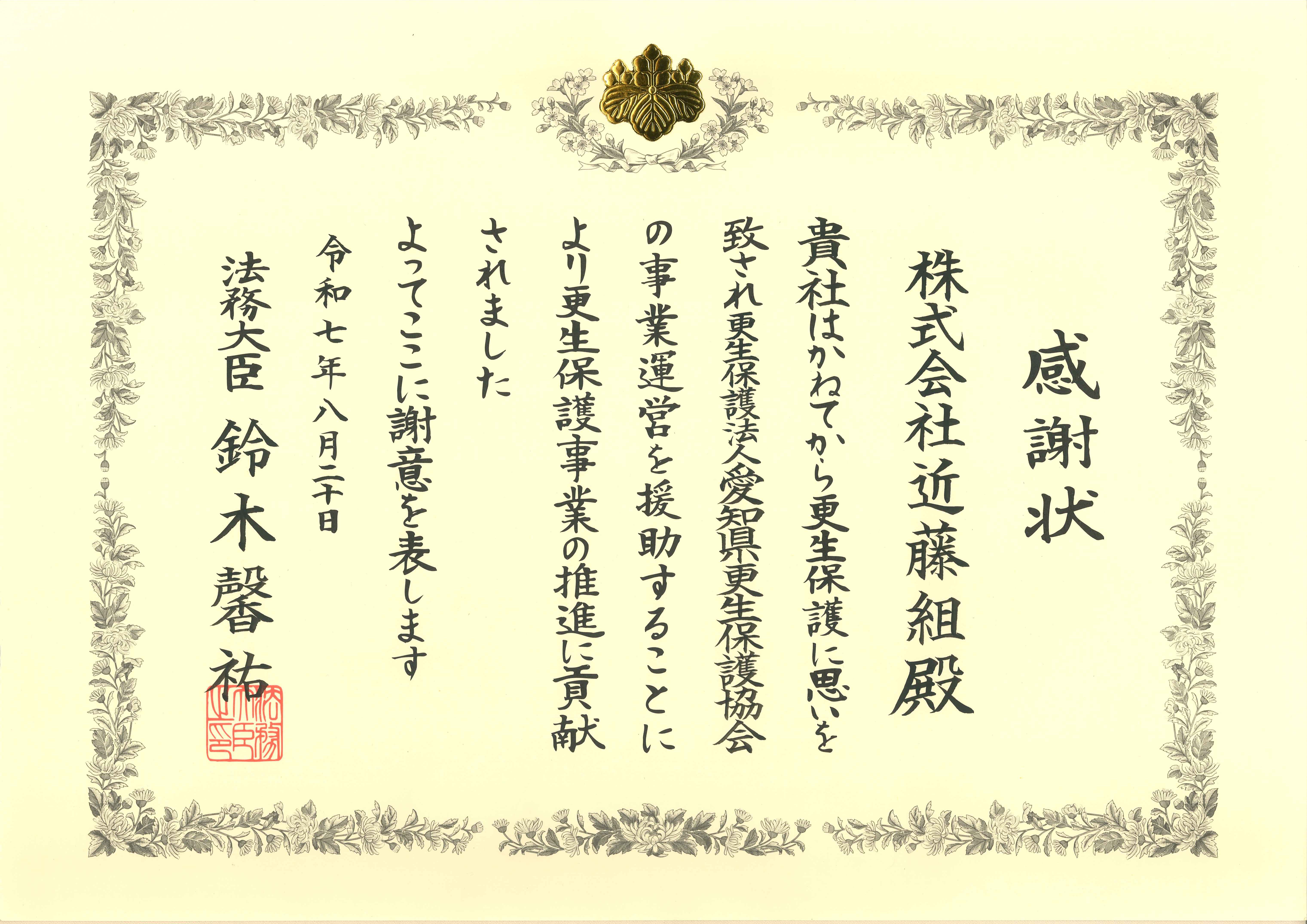 2025年8月20日、法務大臣様より更生保護事業の推進に貢献したことにより感謝状を頂きました。