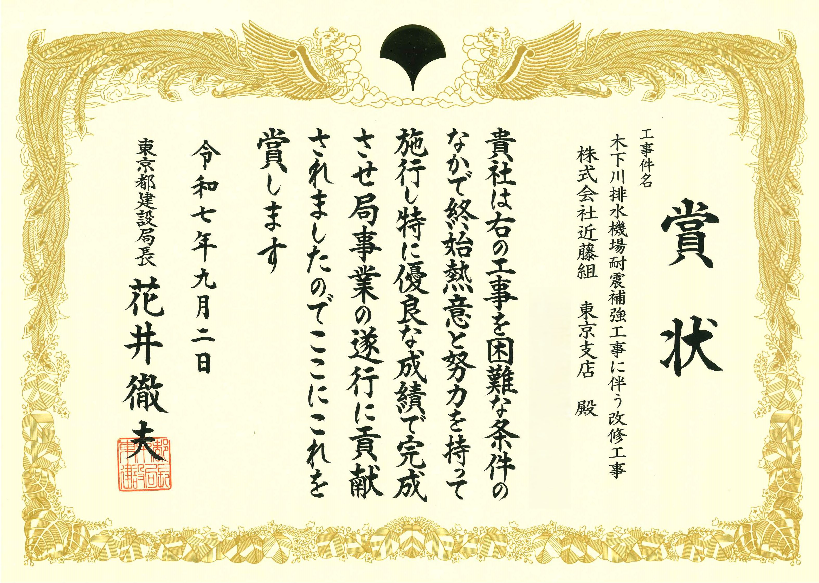2025年9月2日、東京都建設局長様より優れた建設現場従事者として現場代理人兼監理技術者に対し